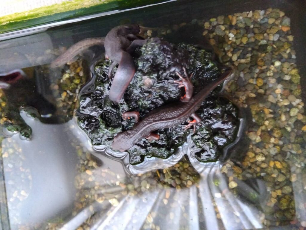 アカハライモリも同様。あばら骨が浮き上がり、足も細く折れてしまいそう。