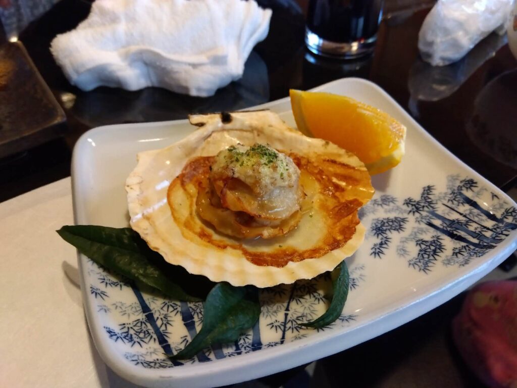 舟盛(大ぶりなヒラメ) 焼きホタテ(冬季はカキ土鍋蒸し)